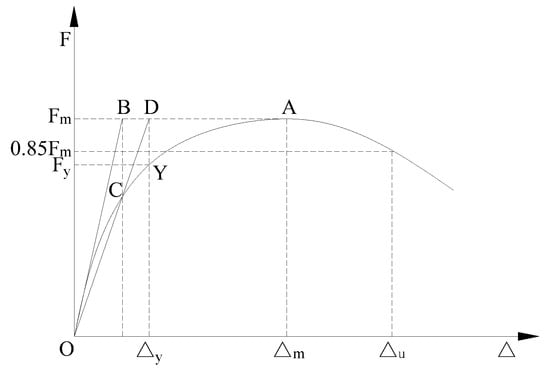In Figure 11, Point O represents the origin point, Point A represents the peak point, Point Y represents the yield point, and Point B, C and D represent the auxiliary point. Besides, Fm represents the peak load, Fy represents the yield load, Δu represents the ultimate displacement, Δm represents the peak displacement, and Δy represents the yield displacement.