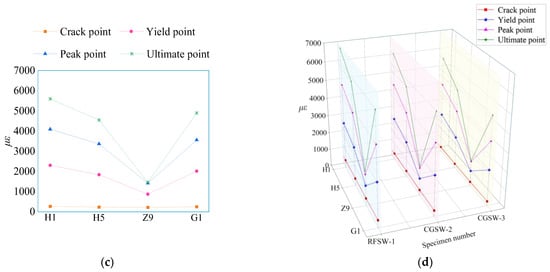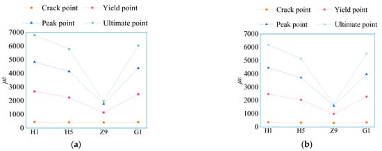 The strain curves of the four measuring points of the specimens at different characteristic points are shown in Figure 12.