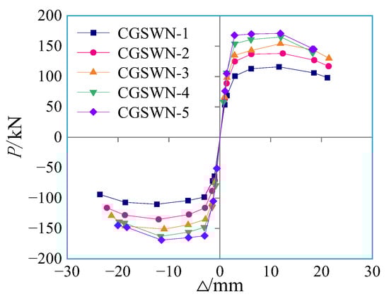 The hysteretic curves obtained from the test are not completely symmetrical. Because there is residual deformation after forward unloading and the residual deformation needs to be offset when reverse loading, the reverse displacement can increase, and there is a virtual displacement in the test process. In addition, due to the existence of a vertical load in the test process, the slip device at the top of the specimen produces large friction, which will have a certain impact.