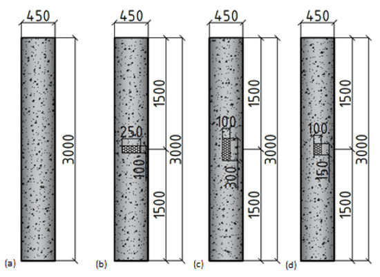 Testing piles: (a) flawless pile; (b) defect Ø250 mm, thickness 100 mm; (c) 100 × 150 × 300 mm; (d) 100 × 150 × 150 mm.