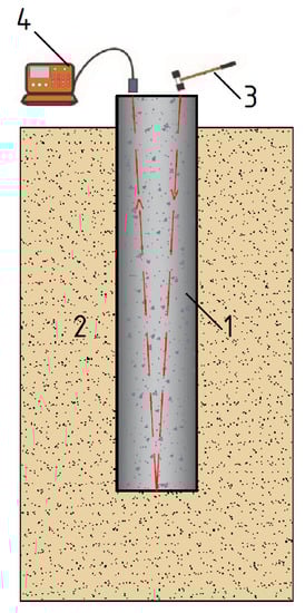 Currently, low strain integrity testing [43,44] is one of the most common methods used for pile integrity control. This method of non-destructive control is based on the principle of acoustic flaw detection, founded on the physical phenomenon of elastic wave propagation—namely, the analysis of the passage and reflection of an acoustic wave in a pile [45,46,47]. The elastic wave is generated with handheld hammer impact on a pile top that is dry and clean. The wave spreads along the pile’s body and reflects off the pile defects, as well as from the pile toe. The reflected waves are recorded by a sensor mounted on the pile head and further processed by special computer software.