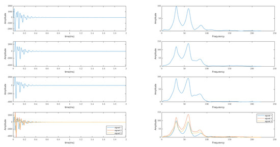 Figure 3 shows the appearance of the received signal in the three experiments and the spectra of these signals. The spectrum is obtained using a Fourier transform. The utilized apparatus immediately provides the generation of this spectrum. Therefore, the signal spectrum obtained through the software application of the instrument was used in further processing. The signals in Figure 3 were taken from the first transducer in three different experiments. The bottom row of Figure 3 illustrates the results of the same three experiments, superimposed onto each other.