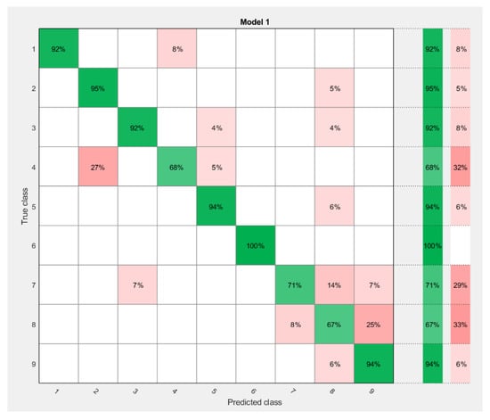 The given ANN classifier was trained on data representing an array of values, where the first five values are the first five peak points of the signal and the sixth value is the class number. The training of the classifier used the membership of each class, where the class was defined as each sensor installed on the pile: Class 1–3: three sensors on defective pile №1; class 4–5: two sensors on defective pile №2; class 6: defect-free pile; class 7–9: defective pile №4. As can be seen from the Confusion matrix results, with an overall accuracy of the ANN classifier (accuracy = 85.9%), class 6 is predicted to be 100% correct. This means that the ANN classifier is 100% accurate in predicting whether there is a defect in the pile. The highest error percentage of 33% is in class 8, and it can be seen that errors occur in false class 7 and 9 instead of class 8. The 7, 8, and 9 sensors are sensors installed on the same defective pile №4. It is probably more appropriate to operate an ANN classifier where all cases that exist are divided into four classes, instead of nine. Under each class, we should refer to the pile numbers, or more precisely, the type of pile defect.
