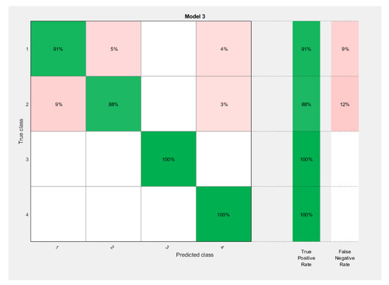 The present ANN classifier was trained on the same data as the classifier with the results shown in Figure 5. The classes were defined by pile defects. The first class is pile defect №1; the second class is pile defect №2; the third class is a defect-free pile; and the fourth class is pile defect №3. The results demonstrate 100% identification of a defective pile, and rather high overall accuracy (accuracy = 91.9%). At the same time, the highest percentage of errors was found between the classification of piles with defect numbers 1 and 2.