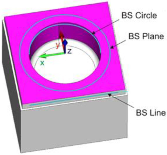 To align the part in the machine coordinate system, a coordinate system consisting of the features shown in Figure 7 was used. The primary feature (spatial rotation) is defined by a circle on the BS Plane. The circle is created from 4 points. The secondary feature (spatial rotation) is defined by a line marked as BS Line consisting of 2 points. The zero position for the X and Y directions is defined by the BS Circle and for the Z axis by the BS Plane. To increase the accuracy of the alignment, a loop for a maximum of 5 repetitions was used with the delta value set to 0.005 mm.