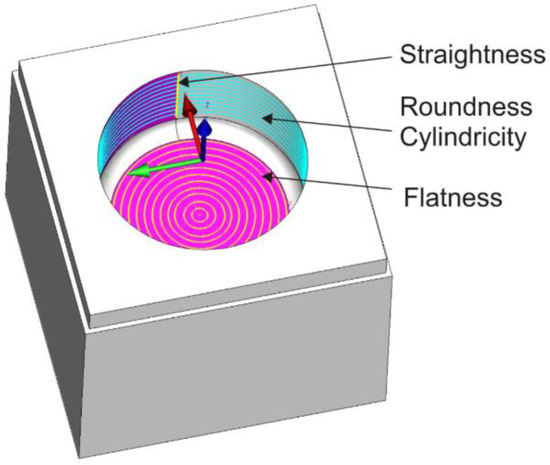 Different methods are used in the evaluation of machined surfaces. Their disadvantage is that they are time- and money-consuming [34]. Customers require ever more precise results in production. One possibility is using the equipment as a coordinate measuring machine, where it is possible to measure different geometric deviations. Authors et al. [35] investigated roundness deviation, where for pocket shape evaluation, diameter, center coordinate, and form deviations were measured. Also examined was the effect of the measuring points on the roundness measurement. The result was that the lowest points were not adequate for the quality evaluation, and a high number of points did not make the measurement more precise. In many cases, circles are measured using 4 points, and hardly ever with more than 16 points. The performed investigations proved that 4-point measurements are not enough, especially as the measured detail is to be combined with another one in narrow tolerance.