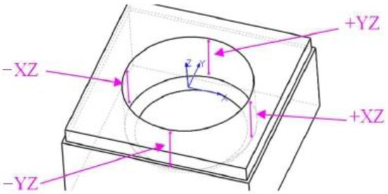 A measurement strategy using 4 line segments was chosen to evaluate the straightness of the cylindrical surface of the pocket. The start of the measurement was at a depth of 1.5 mm from the BS plane, and the end of the measurement was at 13.5 mm. A scanning strategy with a step size of 0.1 mm was used for the measurement, and the LSQ (least squares) method and Spline low-pass filter with wavelength LC = 2.5 mm were used for the evaluation without eliminating outliers. The location and indication of the individual lines for the directness evaluation are shown in Figure 9.