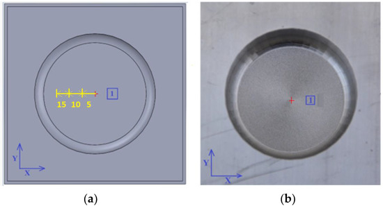 A digital microscope Keyence VHX-5000 was used for the evaluation of the produced parts. This digital microscope allows viewing any area fully focused in less than a second, and its advanced features eliminate the need for focus adjustment. Due to the high frame rate of its camera, the VHX can quickly scan through the focal range of a sample and recognize areas of focus to build a fully focused image. This provides intuitive and instant focusing and satisfies the universal need for focused magnified observation. The lenses, camera, and graphical output are designed to optimize the relationship between depth-of-field, resolution, and brightness. The selected area for the surface texture evaluation in the CAD model (Figure 10a) and in the machined part is shown in Figure 10b. Figure 10a illustrates the places where 3D maps were created. The measurement was carried out at a distance always offset by 5 mm from the center of the machined part.