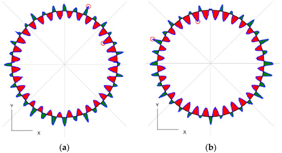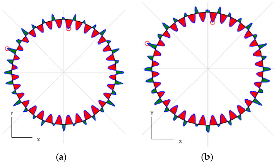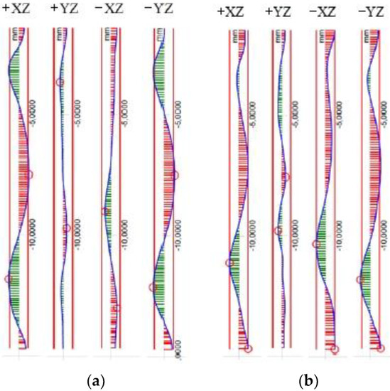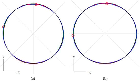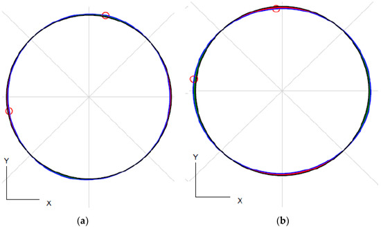 The deviation of the constant Z strategy and circular pocket strategy is shown in Figure 12, and the deviation of the constant stepover-pocket auto border strategy and spiral strategy is shown in Figure 13, which represents a 5th measured circle from BS Plane at a scale of 100:1. The feature was created by LSQ method. The resulting shape of the curves is caused by interpolation in SolidCAM.