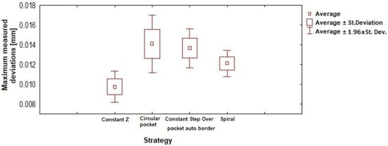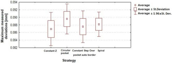 The results for each production strategy are shown in Table 7. The nominal depth of the components produced is 20 mm. The results show that the constant stepover pocket auto border strategy has the smallest deviation from the nominal value at 0.0296 mm. The values of the flatness of the bottom influenced the resulting value of the measured dimension only minimally.