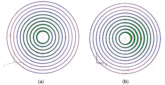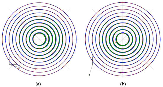 - Spiral—The spiral toolpath is first created as a two-dimensional toolpath and then projected onto the 3D model. The Z-position of the tool is calculated during the projection [43]. The schematic diagram illustrating the constant stepover strategy is shown in Figure 5.