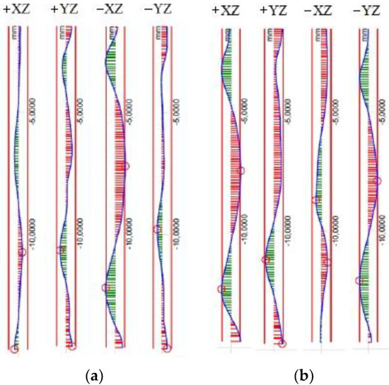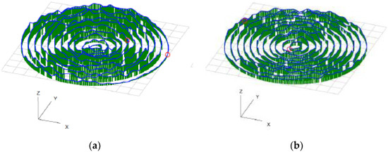 Cylindricity deviations results for the constant Z strategy and circular pocket strategy are presented in Figure 18, and for the constant stepover-pocket auto border strategy, the spiral strategy is shown in Figure 19 with 20× magnification, where the outer circular path represents 1 circular path from the BS_Plane and the inner 10 circular paths. Positive deviations are shown in green and negative deviations are in red.