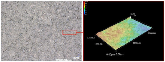 The following figures evaluate the surface texture obtained by different milling strategies when the ball end mill was used. A magnification of 100× and 200× was used to evaluate surface texture. The obtained surface texture with the magnification of 100× was extended by displaying an example of a 3D map of the extracted residual scallop height, further called SH, as shown in Figure 24, Figure 25, Figure 26 and Figure 27. The change of color scale for the spiral strategy corresponded to the achieved value of the scallop height in the corresponding area. Example displays of the obtained residual scallop height values are shown in Figure 24, Figure 25, Figure 26 and Figure 27.