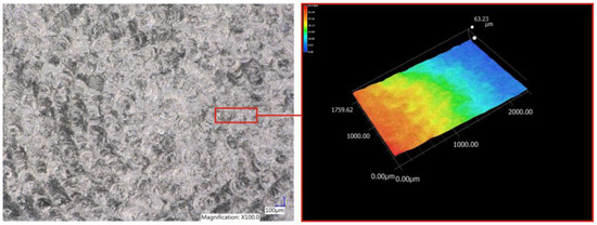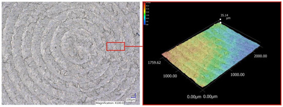 The highest value of the residual scallop height of the workpiece with strategy constant Z was obtained, where a non-oriented machined surface was observed. When circular pocket strategy and constant stepover-pocket auto border, similar values have been reached. Tool marks could be observed on the surface texture achieved by the constant step over-pocket Auto border strategy (Figure 29) and circular-pocket strategy (Figure 30). In both surface textures, the path interval was measured. The obtained 3D map of the residual scallop height for the spiral strategy corresponded with the flatness deviation shown in Figure 23b.