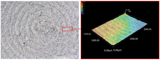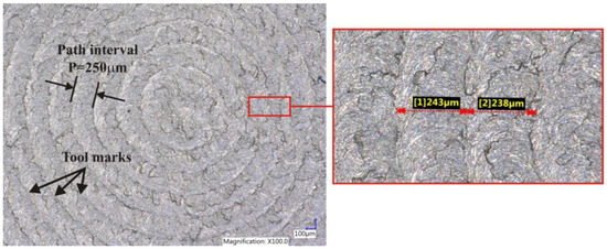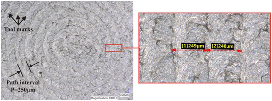 The machined surface shows the obtained period of the paths in the machining process. The measured mark period is approximately equal to the defined path interval (250 μm) in the machining process, as shown in Figure 25 and Figure 26. The individual paths have the shape of concentric circles.