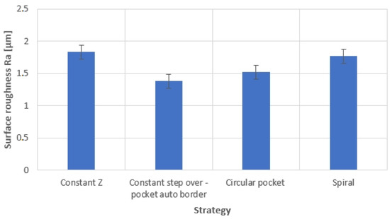 The roughness parameter was the lowest for strategies with circular paths. Similar values were obtained for the strategies circular pocket and constant stepover-pocket auto border.