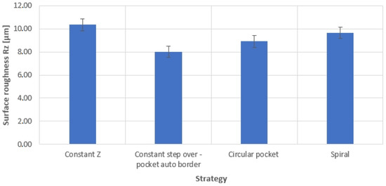 The circular pocket strategy and constant stepover-pocket auto border strategy achieved the lowest values in both roughness parameters Ra and Rz. The constant stepover-pocket auto border reached the Ra values from 1.268 μm to 1.492 μm, and the surface roughness depth Rz reached values from 7.437 μm to 8.701 μm. The Constant Z strategy, where the obtained surface was non-oriented, achieved the highest roughness value. The parameter Ra reached values from 1.699 μm to 2.022 μm the surface roughness depth Rz reached values ranging from 10.104 μm to 10.526 μm. Only slightly lower values were obtained for the spiral strategy in comparison with the constant Z strategy.