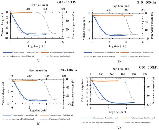 Figure 3a–f indicate both the volumetric and pore pressure responses of the unstabilised (or non-stabilised) and stabilised soils with time during the consolidation stage. A decrease in volume as a result of the dissipation of excess pore water are observed. The volumetric reduction was greater for the unstabilised soils when compared to the stabilised soils. For the stabilised soil samples, the addition of calcium compound-rich agents clearly caused a hardening of the soils resulting in a decrease in the water content of these samples. As could be observed from the pore water pressure (pwp) curves, the time required for the expulsion of water from the non-stabilised soils was more than double those for the stabilised soils across all the samples. Figure 3a–f also generally indicate that consolidation under a higher pressure produced greater volumetric strain. Moreover, the volumetric strain curves were observed to have become asymptotic to the horizontal axis with the passage of time, thus indicating the end of primary consolidation under the given pressure.
