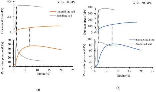Figure 5 is a comparison of the behaviour of unstabilised and stabilised soils along with the pore water pressure changes occurring at the critical yielding points of the stress–strain curves. The failure stresses experienced by the stabilised soils were generally greater than those of the non-stabilised soils. This was mostly due to the hardening of the soils, ultimately resulting in pozzolanic activities from treatment with the calcium-based agents. For soils containing 10% gypsum, the approximate increment in failure stress when the soils were stabilised was much higher (450%) under a constant effective pressure of 100 kPa as compared to the stabilised soils (140%) when the constant effective pressure was 200 kPa (Figure 5a,b). For soils containing 20% gypsum, the increase in stress at failure when stabilised with the additives (lime and GGBS) was about 200% and 70% under constant effective pressures of 100 kPa and 200 kPa, respectively (Figure 5c,d). When the amount of gypsum was raised to 30% in the soil, treatment with the additives caused a rise in the failure by about 120% and 70% under the constant effective pressure of 100 kPa and 200 kPa, respectively (Figure 5e,f). Thus, it is clear that the increase in cell pressure did not seem to necessarily cause a remarkable increment in the failure stress of the soils when stabilised with the binders.
