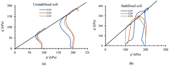 Stress path in p–q space: (a) unstabilised soils; (b) stabilised soils; (c) 10% gypsum content for unstabilised and stabilised soils; (d) 20% gypsum content for unstabilised and stabilised soils; (e) 30% gypsum content for unstabilised and stabilised soils.