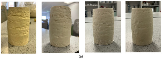 Figure 7 indicates the behaviour of the samples at failure. The pattern of failure for the unstabilised soils was almost similar (with failure indicated as a barrelling of the specimens) from close observations irrespective of the quantity of gypsum content and the level of cell pressure under which they were subjected. Hence, these are represented by few general illustrations for brevity (Figure 7a) These illustrations confirm the general ductile behaviour of the unstabilised soils with subsequent yielding or failure occurring at relatively larger strains. However, for the stabilised soils, shearing or failure indicated as cracking or faults across most of the cylindrical samples was clearly noticeable. As already observed from the stress–strain curves shown previously, the stabilised soils were initially ductile (under very small strains) with the yielding point followed by an almost perfectly plastic behaviour up to about 6–8% of the strain before finally undergoing small amounts of strain softening. Stabilised soils with a higher content of gypsum (particularly 30% gypsum) seemed to be the most brittle and, hence, possessed the lowest yielding or failure stress under the two cell pressures, as noticed previously.