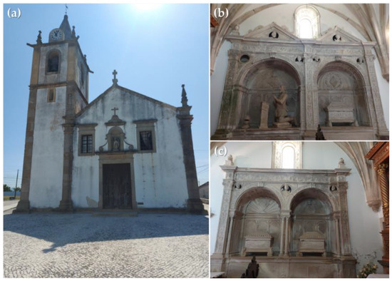 The Church of Trofa or Church of São Salvador da Trofa (Figure 1a) is a Catholic temple located in Trofa (Trofa do Vouga), in the Portuguese district of Aveiro, Águeda county (N 40 36.653′ W 008 28.729′). This church houses the Lemos Pantheon (Figure 1b,c), a remarkable Renaissance sculptural ensemble dating from the 16th century, carved in white Ançã limestone, and attributed to the artist João de Ruão. Commissioned by D. Duarte de Lemos in 1534, the Lemos Pantheon presents itself as a burial place for the ancestors of the third lord of Trofa. It integrates two tombstone groups facing each other, both formed by two arches separated by pilasters and topped by an entablature. On the right-hand side are the tombs of the first lords of Trofa, Gomes Martins de Lemos and his son, João Gomes de Lemos, and their respective wives, D. Maria de Azevedo and D. Violante de Sequeira, leaving the men in the arch nearest the altar. On the opposite side lies buried D. Joana de Melo, wife of the founder, and in the arch closest to the altar D. Duarte de Lemos, with a praying statue [43].
