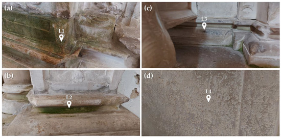 Details of the sampling points (a) L1, DGB at the base of the left pillar in D. Duarte de Lemos tomb; (b) L2, GB at the base of the right pillar in Gomes Martins de Lemos and his son, João Gomes de Lemos tomb; (c) L3, BD behind the tomb chest of D. Maria de Azevedo and D. Violante de Sequeira and (d) L4, SE beneath L3, closest to the floor.