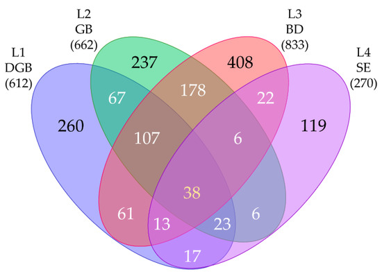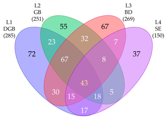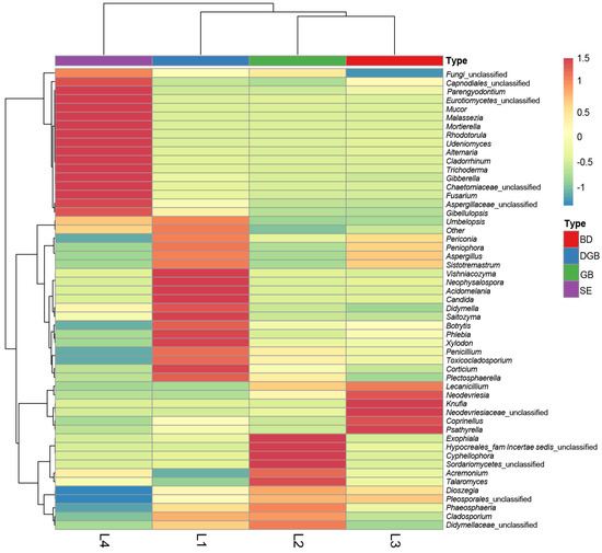 The composition of the fungal community was further analyzed at the genus level. A total of 500 fungal genera were identified via taxonomic summary: 285 in sample L1; 251 in sample L2; 269 in sample L3; and 150 in sample L4. Of these 500 only 43 were common to all four spots, with samples L2 and L3 having the largest number of shared genera. Furthermore, genera were significantly different among samples, and L1 and L3 presented the greatest number of specific genera (Figure 5).