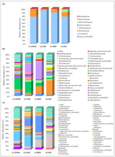 The OTUs were assigned to 7 phyla, 251 families and 500 genera, while only <1% of sequences were not assigned to any known phylum. At the phylum level, Ascomycota (accounting for 76.32% to 94.81%) and Basidiomycota (3.84% to 20.52%) were the two major fungal taxa across all samples. Mortierellomycota was the third most abundant phylum (>5% in L4) but, together with the phyla Chytridiomycota and Glomeromycota, was only detected in samples L1 and L4. Rozellomycota was present only in the L1 and L2 samples. The relative abundance of these last three phyla along with Mucoromycota was lower than 3% and differed across the samples. Figure 3 exhibits the relative abundance at the phylum level (Figure 4a), family level (Figure 4b) and genus level (Figure 4c). For the higher classification levels, only the 20 most abundant family and genera, considered individually for each sample, were discriminated in the graphs. Less abundant taxa were pooled and indicated as “Other”.