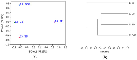 A β-diversity analysis was also performed. Principal coordinates analysis (PCoA) was used to explore and visualize similarities between the fungal communities present in each sample. Samples ordinated closer together have a greater similarity than those that are more distant. The PCoA results with Bray–Curtis distances at the genera level showed that samples from different biodeterioration patterns were not closely grouped together. Unweighted pair-group analysis (UPGMA) based on the relative abundance of fungal communities revealed a distinct clustering pattern between samples that originated from different biodeterioration patterns. Samples L2 and L3 were the most relatable in terms of genera composition; results agree with the Venn diagram and heatmap previously presented in Figure 5 and Figure 6, respectively. Sample L1 was slightly more separated from L2 and L3, while sample L4 showed a strong separation from all the others (Figure 7a,b). This indicates that the compositions of fungal communities in these samples differ significantly from each other (PERMANOVA p-value < 0.005). The saline environment present in sample L4 was probably the major factor shaping this unique community.
