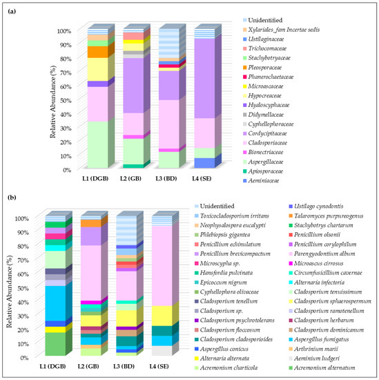 Most of the isolated fungi belongs to phylum Ascomycota (>90%), with phylum Basidiomycota being detected only in sample L3, with 2 identified species, representing 5% of the total abundance for that sample. Figure 7 displays the overall abundance results at the family (Figure 8a) and species levels (Figure 8b).