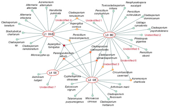 Through the ecological co-occurrence network analyses, it can be observed that most of the isolated species are specific to a distinctive biodeterioration pattern. Ten species were retrieved exclusively from DGB, seven from GB, 13 from BD and two from SE. BD had the highest number of exclusive (13) as well of shared (eight) species. Only Aspergillus fumigatus was present in all the biodeterioration scenarios (Figure 9).