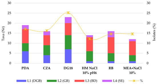 Of the 123 fungal isolates recovered, the majority were obtained from DG18 (25%), followed by PDA (17%), CZ (16%), RB (15%), MEA NaCl 10% (15%) and lastly HM NaCl 10% (12%) (Figure 10). Additionally, DG18 provided the highest number of distinct taxa across all samples. These variations are determined according to their specific growth needs and demonstrate a high dominance of xerophilic species, distinguished by their ability to grow under conditions of low water activity. Only samples L2 and L3 had a wide range of distinct taxa isolated across all culture media, indicating a great versatility in the species present in those samples.