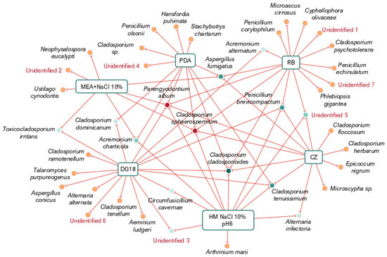 Co-occurrence network displaying the overlap of the cultivable species between the different culture media used for fungal isolation.
