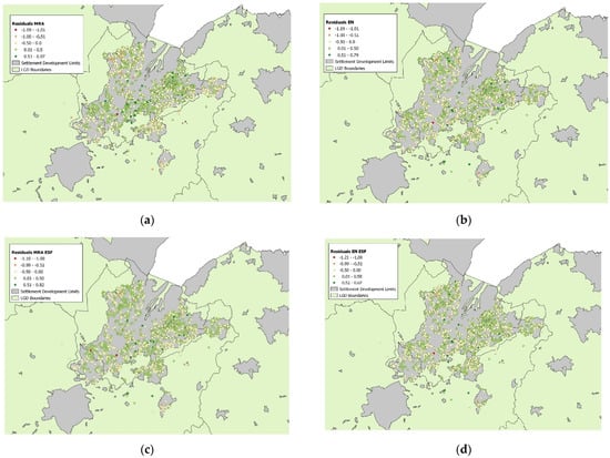 Whilst the findings reveal a notable increase in model performance, the inclusion of the ESFs has reduced the residual error and level of spatial autocorrelation across the study area geography (Figure 4a–d), with the delineated spatial models demonstrating larger clusters of heightened residuals within specific locales. In essence, there appears larger differences between the actual and estimated sales prices which the standard regression and Elastic-net models have not successfully addressed as a consequence of SA and not detecting the underpinning spatial patterns.