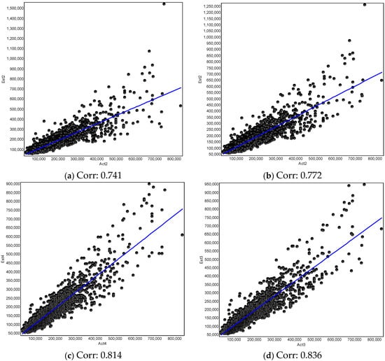 Figure 5. Scatterplots of observed house vs. predicted prices. (a) MRA model. (b) Elastic-net model. (c) MRA ESF model. (d) Elastic-net ESF model.