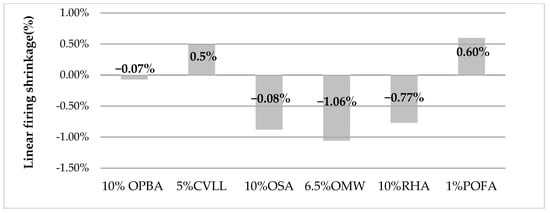 Linear firing shrinkage for samples made with lignocellulosic biomass ash: olive bottom ash (OPBA) [60], combustion of olive pomace (CVLL) [61], olive stone ash (OSA) [62], oil mill wastewater (OMW) [63], Rice Husk ash (RHA) [63], palm oil fuel ash (POFA) [70].