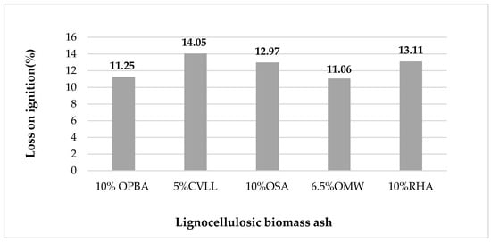 Loss of ignition for samples made with lignocellulosic biomass ash: olive Bottom ash (OPBA) [60], combustion of olive pomace (CVLL) [61], olive stone ash (OSA) [62], oil mill wastewater (OMW) [63], Rice Husk ash (RHA) [63].