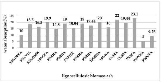 Water absorption for samples made with lignocellulosic biomass ash: 10% OPBA [60], 5% CVLL [61], 6.5% OMW [63], 10% OSA [62], 2% RHA [32], 4% RHA [31], 5% RHA [64], 5% RHA [67], 5% RHA [68], 10% RHA [65], 10% WA [65], 5% SBA [67], 5% SBA [68], 5% SBA [66], 1% OPFA [70], 5% OPFA [69].