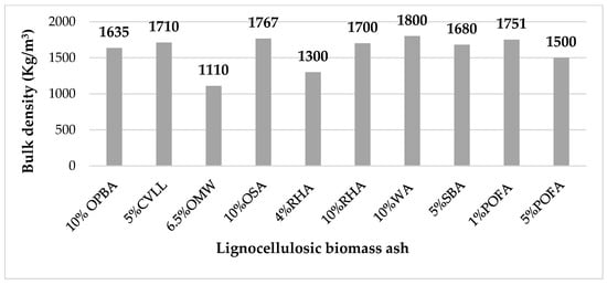 Bulk density for samples made with lignocellulosic biomass ash: 10% OPBA [60], 5% CVLL [61], 6.5% OMW [63], 10% OSA [62], 4% RHA [31], 10% RHA [65], 10% WA [65], 5% SBA [66], 1% OPFA [70], 5% OPFA [69].