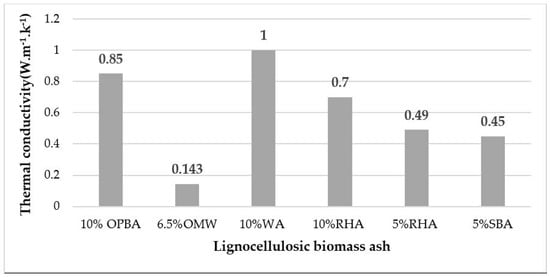 Thermal conductivity for samples made with lignocellulosic biomass ash: 10% OPBA [60], 6.5% OMW [63], 10% WA [65], 10% RHA [65], 5% RHA [68], 5% SBA [68].