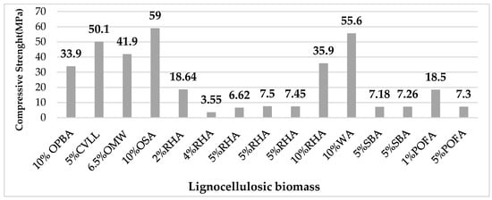 The density of bricks made from lignocellulosic biomass ashes ranges from 1110 to 18,000 kg/m3, as shown in Figure 4. The amount of ashes used in the matrix plays a major role in this difference. It has been established in all studies that brick density decreases as the reinforcement rate increases. However, as depicted in the diagram of Figure 5, the highest density was achieved by adding 10% of wood stone ash (WA) [65], whereas the lowest density was achieved by adding 6.5% of olive mill wastewater (OMW) [63]. The chemical composition as well as the type of combustion of these ashes largely affect the density of the final products. The incomplete combustion of lignocellulosic waste generates an increase in the content of organic matter as well as of unburned carbon in the chemical composition of the produced ashes. When these components are present during the firing of the fired bricks, they react as porogen agents and leave pores behind that reduce the density of the finished goods. The percentages of organic matter and unburned carbon in the WA ashes were 10.4% and 11.45%, whereas they were 11.61% and 46% in the OMW ashes, explaining the variations in the densities measured.