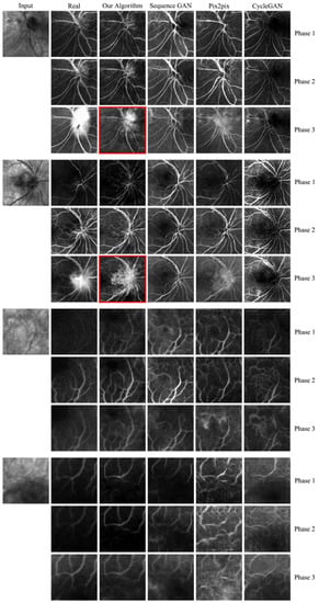 - Li, W.; He, Y.; Kong, W.; Wang, J.; Deng, G.; Chen, Y.; Shi, G. SequenceGAN: Generating fundus fluorescence angiography sequences from structure fundus image. In Proceedings of the International Workshop on Simulation and Synthesis in Medical Imaging, Strasbourg, France, 27 September 2021; Springer: Cham, Switzerland, 2021; pp. 110–120. [Google Scholar]