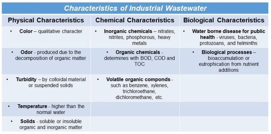 Industrial wastewater is characterized not only by the containment of grease and oils, but also by high turbidity, high levels of chemical oxygen demand (COD) and biochemical oxygen demand (BOD), and suspended and dissolved solids. These high amounts must be reduced or eliminated before discarding the wastewater into water bodies. The main characteristics of industrial wastewater are classified into physical, chemical, and biological categories (Figure 1.). The treatment is a demanding, multi-step process with the primary purpose to reduce COD and BOD levels by removing as many contaminants as possible. Conventional industrial water treatment does not remove sufficient amounts of pollutants entering watercourses; thus, industrial wastewater is considered potentially hazardous to freshwater ecosystems [3].