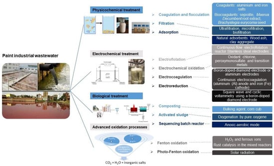 The recently used treatment techniques for the paint industry effluents can be divided according to the treatment’s characteristic into physicochemical, biological, and electrochemical treatment and advanced oxidation processes (Figure 3).
