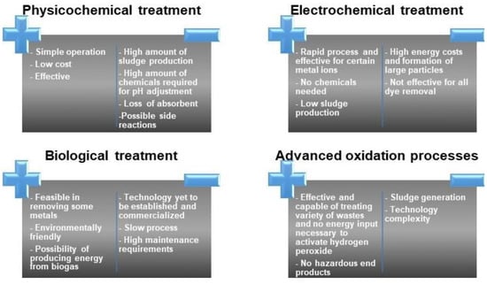 The commonly used methods include coagulation, adsorption [29], flocculation, filtration, electrochemical processes [30], advanced oxidation processes, and biological processes such as composting [31,32,33].