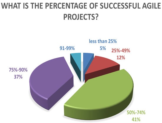 Regarding the effect of Agile on project success, participants were asked about their insight on the success rate of Agile projects. Responses received are summarized in Figure 7. From this figure, it can be observed that 41% of the survey respondents think that the success rate of Agile projects is 50% to 74%, 37% think that the success rate is 75% to 90%, 12% think the success rate of Agile projects is between 25% and 49%, and 5% think that it is less than 25%.