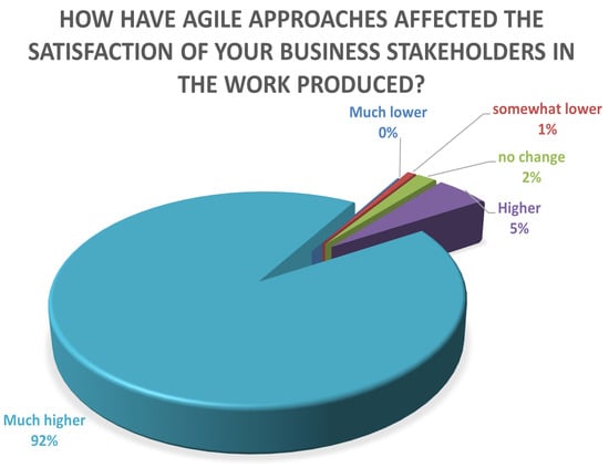 The survey respondents’ point of view regarding the satisfaction of the project stakeholders when using Agile is plotted in Figure 8. As evident from this figure, a heavy majority of 92% of our survey respondents think that Agile approaches have “Much Higher” positive effects on stakeholder satisfaction while 5% think that the effect on stakeholder satisfaction is “Higher”.
