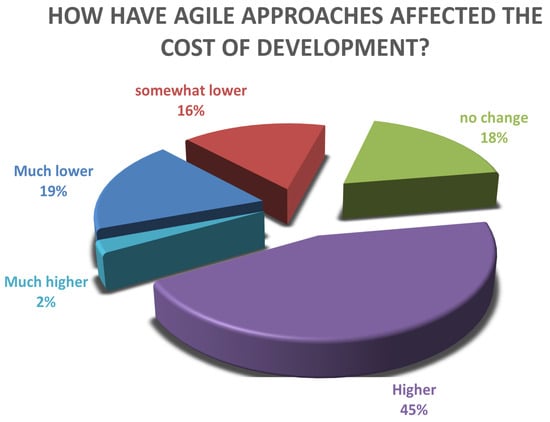 Figure 10 summarizes the response of the survey participants regarding the effects of Agile on reducing the project development cost. This figure shows that 2% of our survey respondents think that Agile approaches have “Much Higher” effects on the reduction of development cost, the majority view, i.e., 45% is that the effect is “Higher”, 18% think that there is no effect, 16% think that the effect is “Somewhat Lower” and 19% think that it is “Much Lower”.