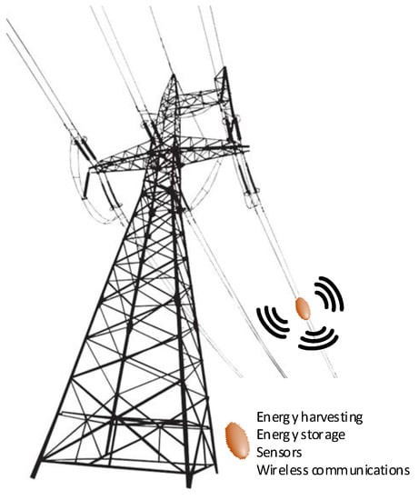 After the digital revolutions due to the introduction of the computer and the Internet, the Internet of Things (IoT) is considered to be the third revolution, offering many potential advantages to smart grids, such as fault detection and prediction or disaster prevention and prediction, which are complex problems that transmission system operators have to deal with. Therefore, IoT technology can potentially improve power transmission stability, availability, and reliability []. Electric power lines are the arteries of today’s power systems; therefore, their efficiency, reliability, and stability profoundly impact daily life and the national economy. Transmission lines may operate in remote areas, making routine inspections complex and expensive. Environmental factors such as wind, rain, ice, or extreme temperatures affect the operation of transmission lines. Although the rate of failures in transmission systems is lower than in distribution systems, the first tends to affect more customers and generate higher outage costs. Therefore, the use of self-powered IoT sensors for real-time monitoring of transmission lines, as shown in Figure 1 [], has great potential to solve the problems mentioned above [].